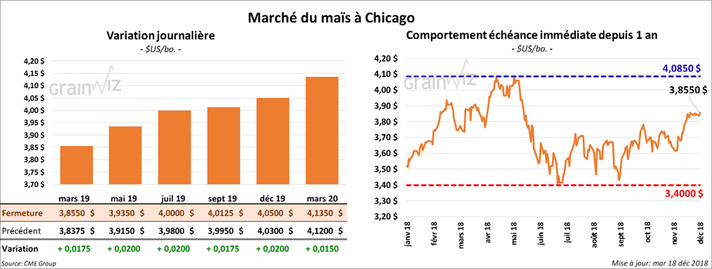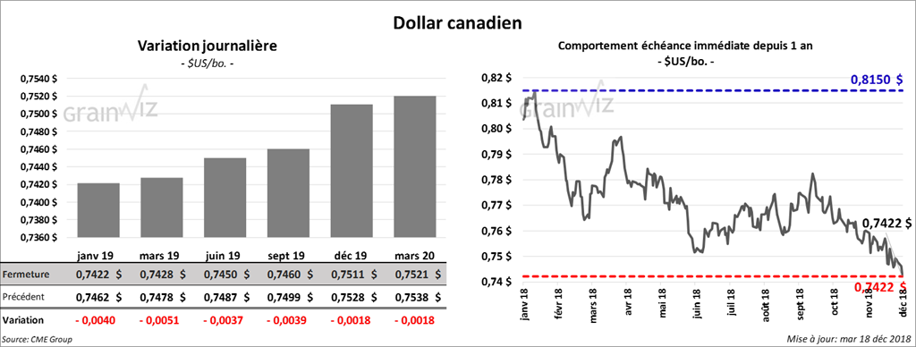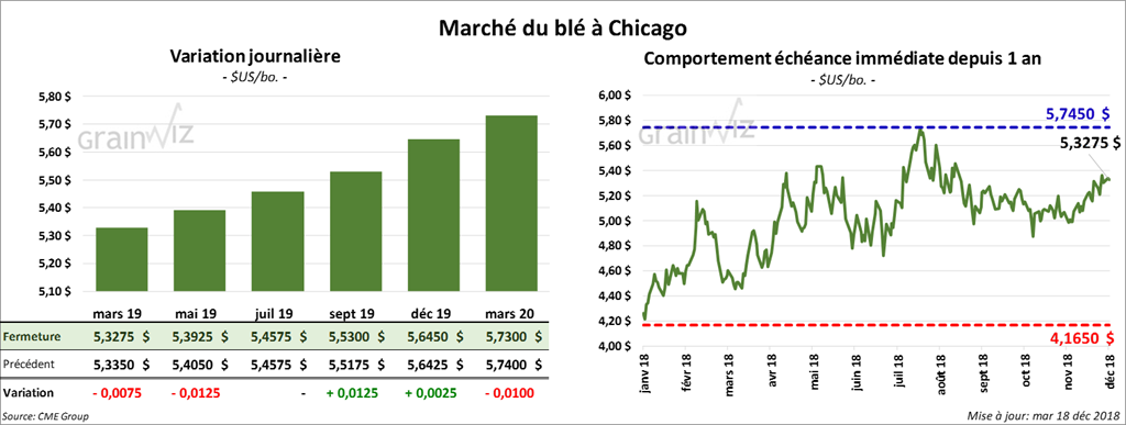 À la fermeture des marchés, la plupart des contrats de blé à Chicago comme à Kansas avaient perdu de 2 à 5 cents. À Minneapolis, les baisses étaient de 5 à 8 ½ cents. Actuellement, le contrat de mars 19 est l’échéance la plus rapprochée. Le «spread» CBT-KC à échéance la plus rapprochée était en baisse à 15 ½ cents.