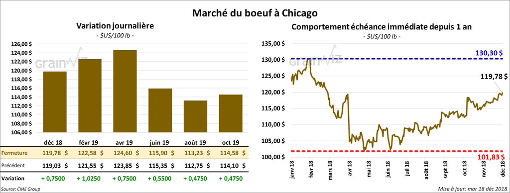 Pour les contrats de bœuf US aux échéances les plus rapprochées, le marché de Chicago a terminé la journée avec des gains de 45 cents à 1,025 $. Les contrats de veau ont également fini la session à la hausse de 60 cents à 1,025 $.