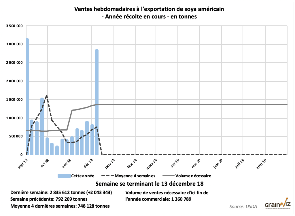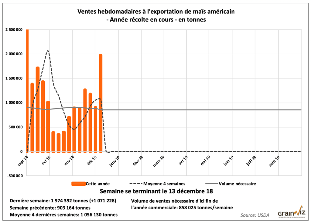 Dans la semaine du 13 décembre dernier, les ventes à l’exportation de maïs US ont été de 1,974 million de tonnes, un résultat qui se situait dans les attentes du marché. À noter qu’il s’agit des plus grosses ventes à l’exportation de maïs US à avoir été enregistrées depuis le début de l’année commerciale en cours.