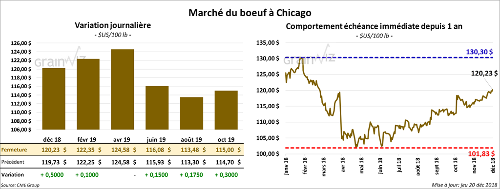 Le 19 décembre dernier, le CME feeder cattle index était en hausse de 26 cents à 145,87 $. Cet après-midi, la valeur du surgelé a été dans le vert. La découpe «Choice» était en progression de 77 cents à 212,47 $. Celle «Select» a pris 41 cents à 205,26 $.