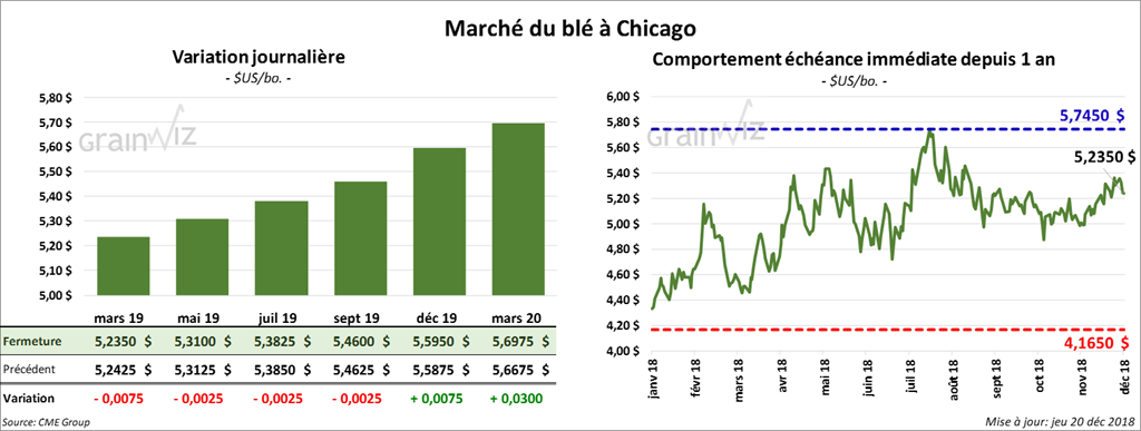 Vers la fermeture des marchés à Chicago et à Kansas, les contrats de blé US affichaient des petits gains. À Minneapolis, le blé de printemps a clôturé sur une note partagée à une fraction de cent. À Chicago, les contrats étaient en hausse de 1 à 3 cents. À Kansas, le HRW a fini au neutre à haussier de 1 cent/bo.