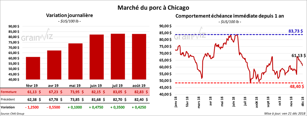 Le 19 décembre dernier, le CME Lean Hog Index était en baisse de 35 cents par rapport au jour précédent à 54,65 $. Cet après-midi, la valeur moyenne des découpes de porc a été en progression de 73 cents à 71,32 $. Sur une base nationale, le prix moyen au comptant de la carcasse était en baisse de 56 cents à 44,07 $.