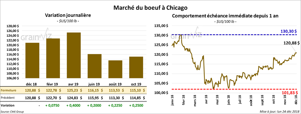 Vendredi dernier, le USDA estimait le cumulatif hebdomadaire des abattages sous inspections fédérales à 2,737 millions de têtes. C’était une augmentation de 125,000 têtes comparativement à la semaine dernière et de 260,000 têtes par rapport à la même période en 2017. Certains abattoirs ont augmenté la cadence en prévision du congé de Noël.