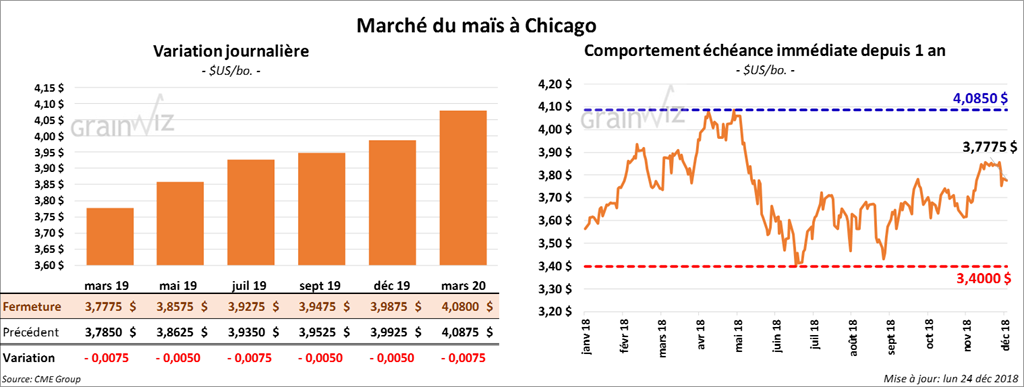 En cette session écourtée, la majorité des contrats de maïs à Chicago ont terminé en baisse d’une fraction de cent.