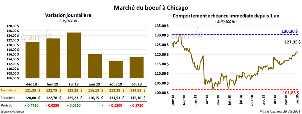 Les contrats de bœuf à Chicago ont fini la session sur une note partagée. Le contrat de décembre 18 a terminé en hausse de 47,5 cents. Il devrait expirer lundi prochain.