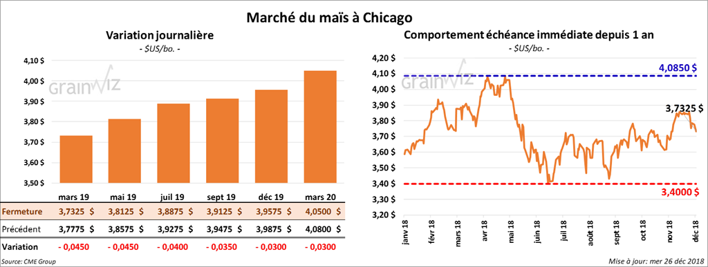 La majorité des contrats de maïs à Chicago ont terminé la session en baisse de 3 à 4 ½ cents. Malgré la hausse du prix du pétrole brut sur le marché américain, celui de l’éthanol US était en baisse notamment en raison des marges trop faibles. La force du dollar US et la chute des prix observée dans les autres grains ont également pesé sur la balance.