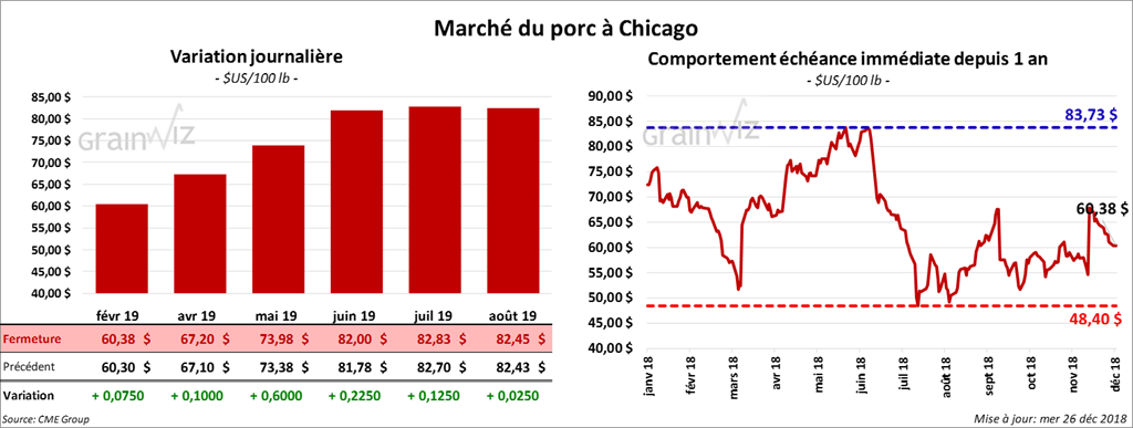 Le 20 décembre dernier, le CME Lean Hog Index était en baisse de 78 cents comparativement au jour précédent à 53,87 $. Cet après-midi, la valeur moyenne des découpes a été en recul de 69 cents à 70,63 $. Sur une base nationale, le prix moyen au comptant de la carcasse était en progression de 44 cents à 44,53 $.