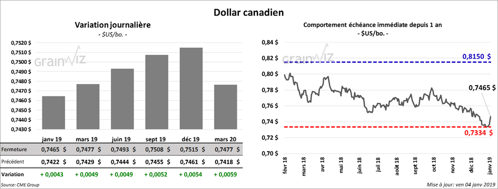 À noter que le USDA a annoncé cet avant-midi, la suspension des publications des rapports concernant l’offre et de demande (WASDE), la production des grains et les stocks de grain qui étaient prévus le 11 janvier prochain. La fermeture partielle du gouvernement américain en explique la situation. Le retour à la normale viendra lorsque le USDA aura la totalité de ses financements.