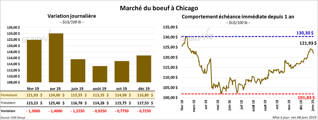 Les contrats de bœuf à Chicago ont terminé la session en baisse de 72,5 cents à 1,40 $. Pour la semaine, le contrat de février 19 était en recul de 1,81 %. Les contrats de veau aux échéances les plus rapprochées ont également fini dans le rouge par 3 chiffres. Pour la semaine, le contrat de janvier 19 a perdu 2,8 %.