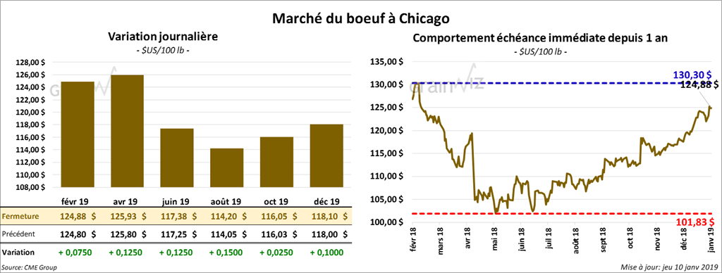 Ce jeudi, les contrats de bœuf à Chicago ont terminé la session avec des gains légers. Quant aux contrats de veau, ils ont fini sur une note partagée. Le contrat janvier 19 a reculé de 7,5 cents.