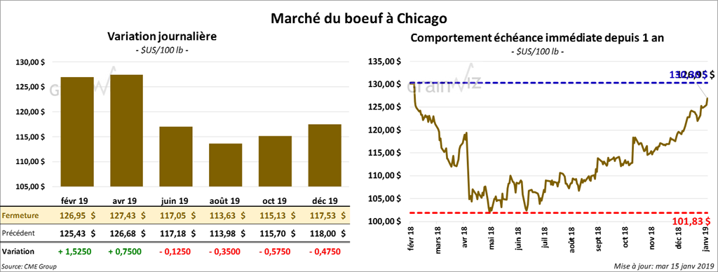 Les contrats de bœuf aux échéances le plus rapprochées ont fini en hausse de 75 cents à 1,525 $. Par contre, ceux différés ont clôturé avec des pertes. La majorité des contrats de veau ont terminé dans le vert. Le contrat janvier 19 a fait exception en baissant de 10 cents.
