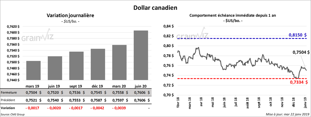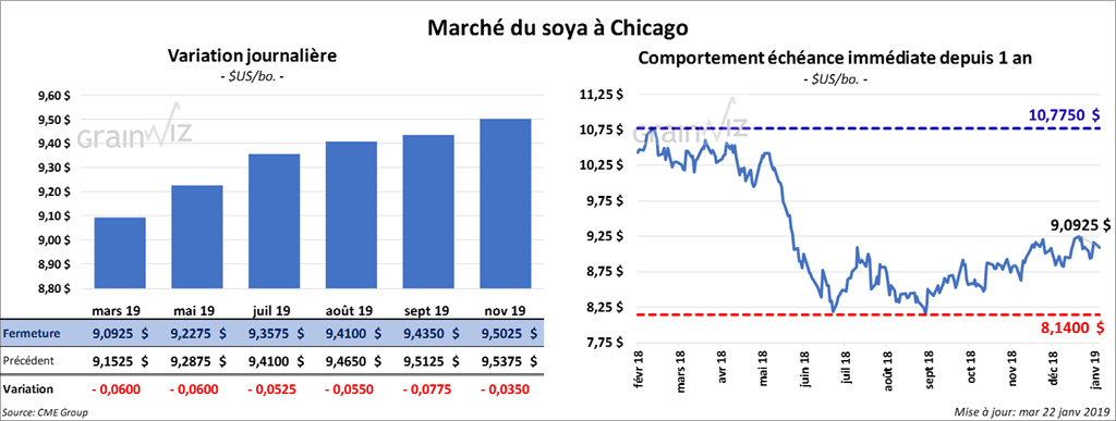 Les contrats de soya US aux échéances les plus rapprochées ont fini la session en baisse de 5 à 7 ½ cents. Les contrats de tourteau ont perdu 2,10 $/tonne. Par contre, l’huile a gagné 5 points.