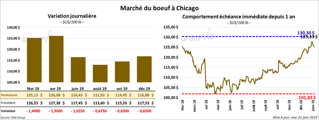 La majorité des contrats de bœuf à Chicago ont fini la journée en baisse de 65 cents à 1,40 $. Les contrats de veau ont subi le même sort en perdant de 40 cents à 1,45 $.