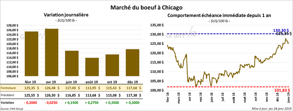 Ce jeudi, les contrats de bœuf à Chicago ont eu une progression partagée. Ceux aux échéances les plus rapprochées ont fini la journée en recul de 2,5 à 20 cents. Les autres, aux échéances plus éloignées, ont terminé la session en hausse.