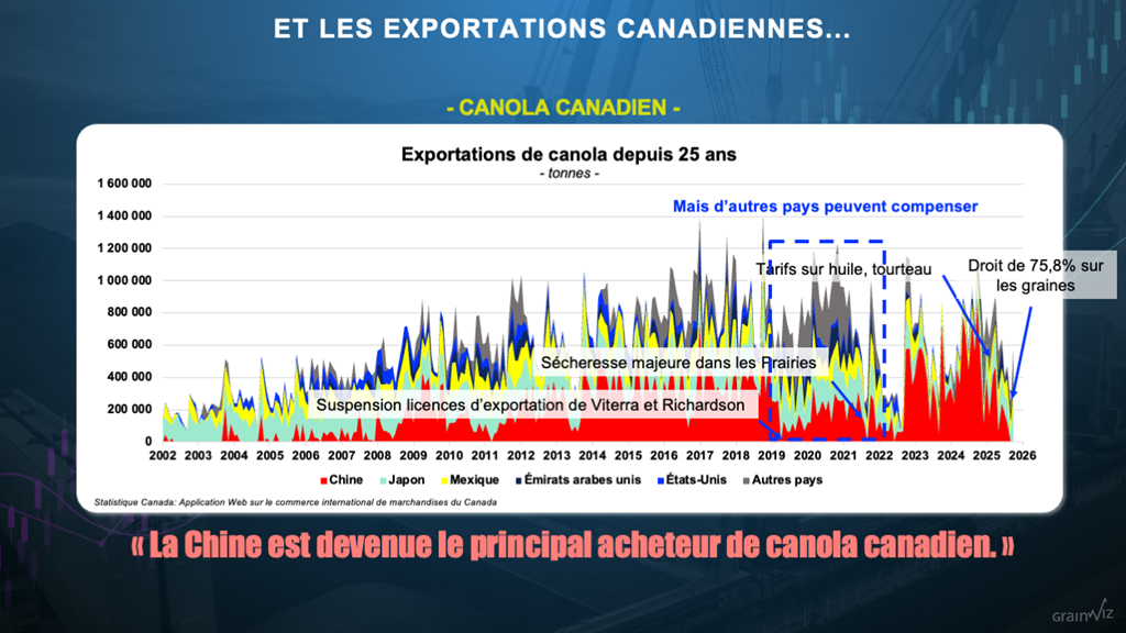 Bonne nouvelle pour le marché du canola. La visite de M. Carney en Chine aura porté fruit. (Le Canada conclut un accord avec la Chine sur les questions agricoles) Après voir mise en place des tarifs sur l’huile et le tourteau de canola canadien à l’hiver dernier, puis imposé en début d’automne un tarif de 75,8% sur les graines de canola canadien, la Chine serait maintenant disposée à abaisser les droits sur le tourteau et les graines de canola d’ici le 1er mars prochain. À savoir si ceux sur l’huile de canola seront aussi revus à la baisse est plus ambigu.