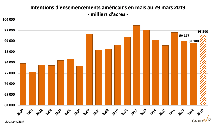 Les marchés digèrent mal la hausse des intentions d'ensemencements américains de maïs plus importantess que prévues à 92,8 millions d'acres. La moyenne des prévisions était plus modérée à 91,3 millions d'acres vs 89,1 millions d'acres l'an dernier.
