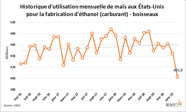 Pour le mois de février dernier, l'utilisation de maïs pour la fabrication d'éthanol aux États-Unis a atteint un creux inégalé depuis avril 2016.