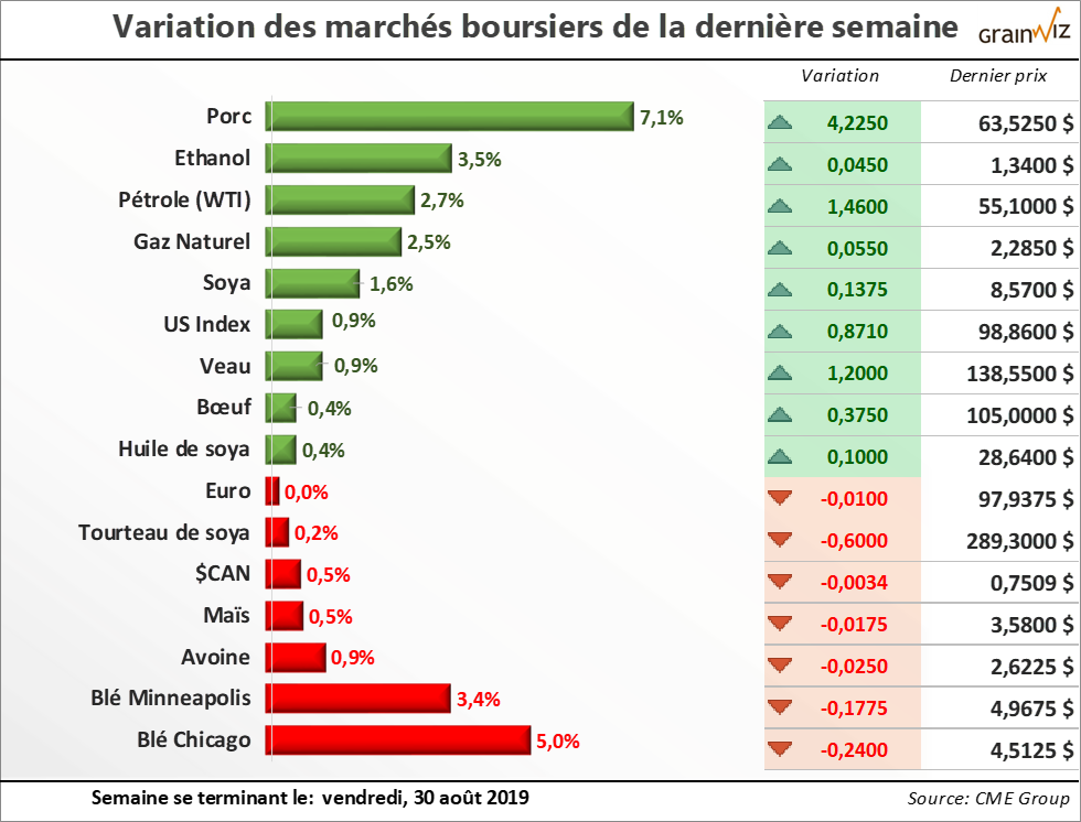 Les nouvelles n'ont pas été légion dans la dernière semaine. L'état des cultures aux États-Unis prend du mieux, laissant miroiter la possibilité que la saison puisse se terminer sur une meilleure note que prévu. Plusieurs organisations ont d'ailleurs réajusté à la hausse leurs prévisions de rendement... Pour en savoir plus sur la situation actuelle et la tendance des marchés des grains et des viandes au Québec, lisez la suite dans la dernière édition du 03 septembre 2019 de la lettre financière.