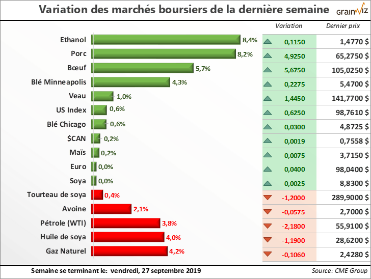 Dans ce contexte, à noter qu'au moment de publier cette édition, des résistances importantes ont été franchies dans les marchés du maïs, du soya et du blé. Considérant la position nette vendue des spéc...u Pour en savoir plus sur la situation actuelle et la tendance des marchés des grains et des viandes au Québec, lisez la suite dans la dernière édition du 30 septembre 2019 de la lettre financière.