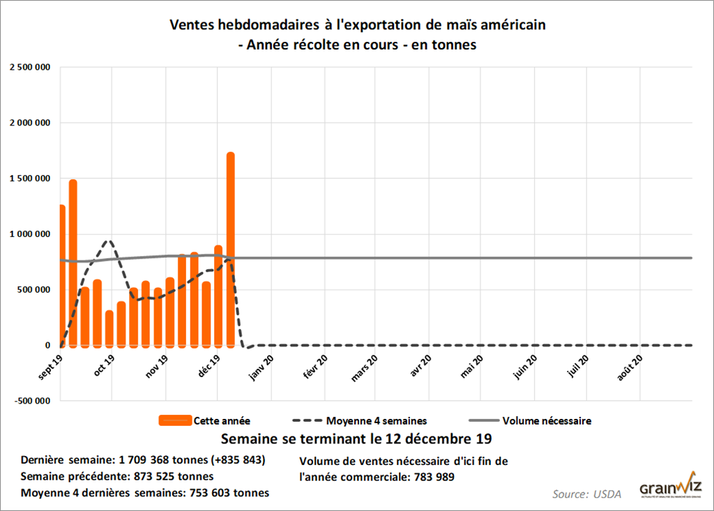 La demande de maïs américain semble gagner de plus en plus de traction que ce soit pour la demande domestique animale, mais également avec le rythme des ventes à l'exportation et de la production d'éthanol à la hausse. À ceci s'ajoute le biais certainement positif d'un accord commercial États-Unis et Chine qui devrait profiter aux exportateurs américains de maïs, drêche et éthanol.