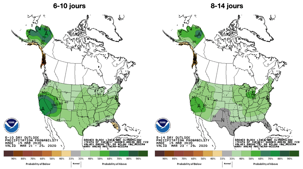 Les ensemencements ont débuté dans le sud des États-Unis et les prévisions 6-10 et 8-14 proposent toujours des précipitations plus importantes qu...'