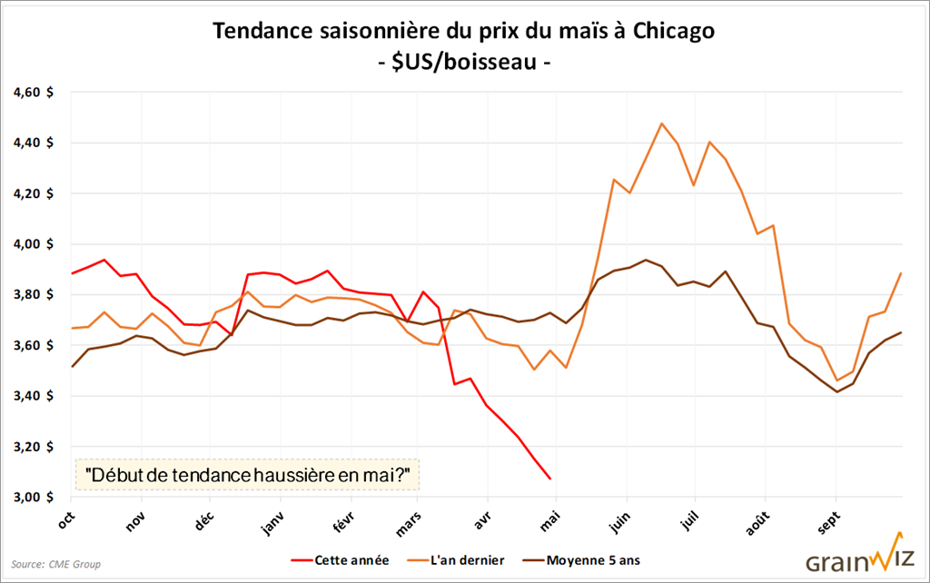 Suivant la tendance saisonnière, le marché du maïs à Chicago "devrait" afficher un peu plus de fermeté ce mois-ci. Mais avec le contexte très particulier du COVID-19, ainsi que la chute de la demande de maïs (... ethanol), est-ce que se sera le cas cette année reste à voir.