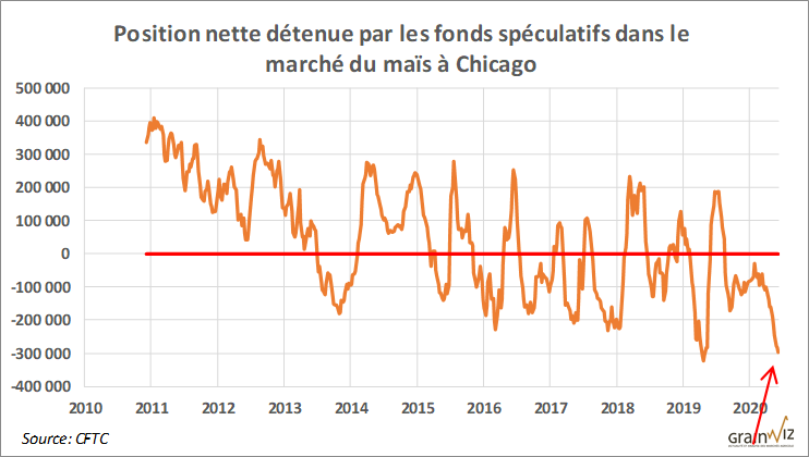 Les spéculateurs détiennent maintenant une très importante position nette vendue, ce qui laisse sujet à de bons rallyes le marché du maïs à Chicago, pour autant qu'il y ait matière à s'inquiéter pour la prochaine récolte américaine de maïs.