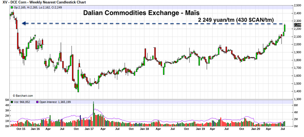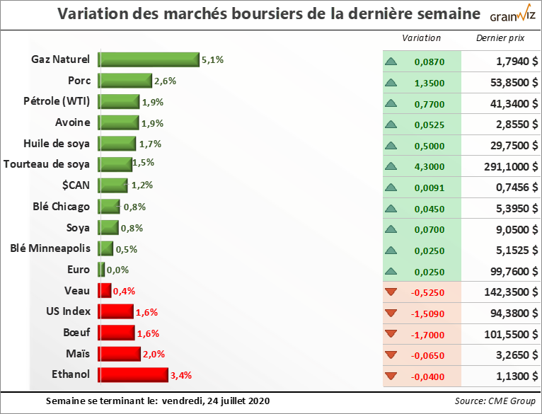 Par contre, avec le stade de la soie maintenant très avancé (59% en début de semaine dernière), et surtout un état des cultures qui demeure dans l'ensemble excellent et au-dessus des normales aux États-Unis (on prévoit une hausse de +1% à 70% "bon à excellent pour cette semaine), il demeure de plus en plus difficile de statuer que le rendement moyen américain prévu à un record de 178,9 bo/acre puisse afficher un recul important, assez pour éviter un bond des stocks... Pour en savoir plus sur la situation actuelle et la tendance des marchés des grains et des viandes au Québec, lisez la suite dans la dernière édition du 27 juillet 2020 de la lettre financière.
