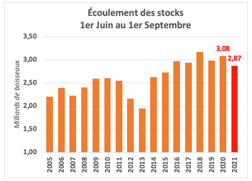 Du 1er juin au 1er septembre, la disparition (... demande) de maïs aux États-Unis a été de 2,87 milliards de boisseaux, à son plus bas depuis 2015.