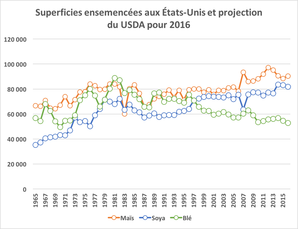 À l'opposé, le USDA entrevoit une baisse des superficies cultivées en soya et en blé à respectivement 82 millions d'actes (-1,4% vs 2015) et 53 millions d'actes (-2,93% vs 2015). Il s'agirait des plus faibles superficies cultivées en blé aux États-Unis depuis près de 50 ans.