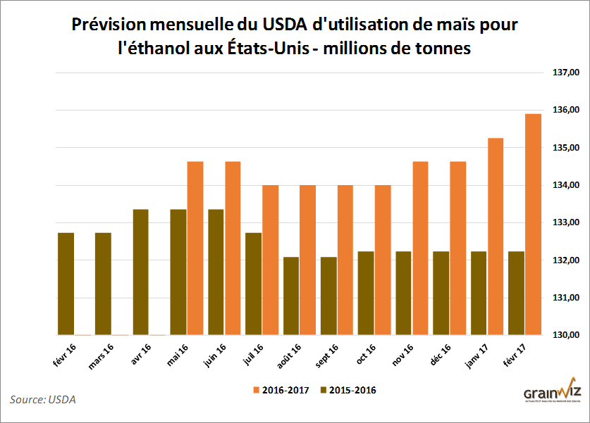 Pour une 3e fois depuis l'automne, le USDA aura ajusté à la hausse sa prévision d'utilisation de maïs pour l'éthanol aux États-Unis à un nouveau record de près de 136 millions de tonnes.