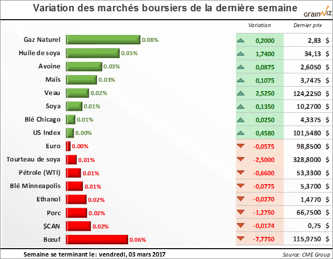 Maïs - La rumeur démentie rapidement par la Maison-Blanche à l'effet que l'administration Trump envisageait un changement au mandat de carburant renouvelable aux États-Unis avec un passage du E10 au E15 (10% d'éthanol dans l'essence à 15%) aura eu un effet positif sur le marché du maïs dans la dernière semaine.