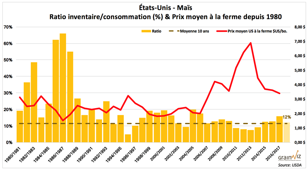 Avec une demande en maïs comparable à celle de cette année, ainsi qu'un rendement dans la moyenne des dernières années, le ratio inventaires/consommation de maïs aux États-Unis reculerait pour la 1er fois en 4 ans l'an prochain.