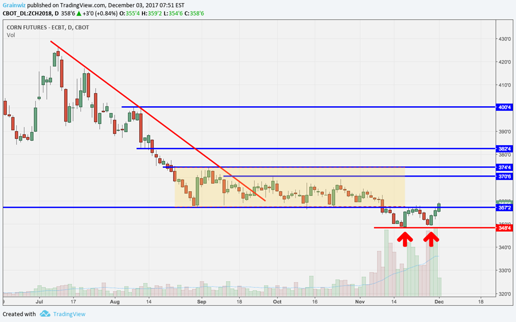 À Chicago, le marché du maïs cherche à se raffermir. La formation d'une figure de type double creux combiné à un retour au-dessus du support du canal neutre précédent laisse entendre qu'un creux saisonnier définitif aurait été maintenant atteint. À la hausse, l'objectif clé pour les prochaines semaines est la zone de résistance 3,70-3,75 $US/boisseau.