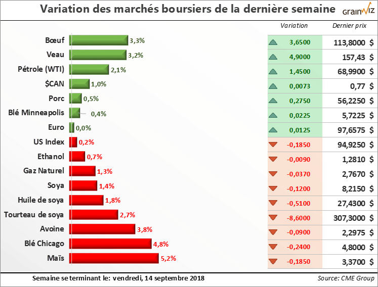 Maïs - Les perspectives du côté de la demande pour le maïs demeurent très intéressantes, avec une disponibilité de maïs qui devrait toujours reculer pour la prochaine année, et ce, autant aux États-Unis que dans le monde. Toutefois, les marchés n'avaient pas anticipé l'ajustement à la hausse important du rendement américain qu'a proposé mercredi dernier le USDA, forçant ceux-ci à ajuster le tir avec une forte correction des prix dans les derniers jours.