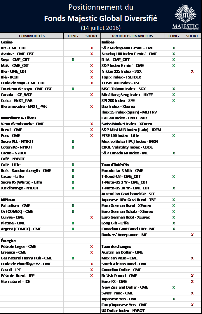 Positionnement hebdomadaire du Fonds Majestic Global Diversifié