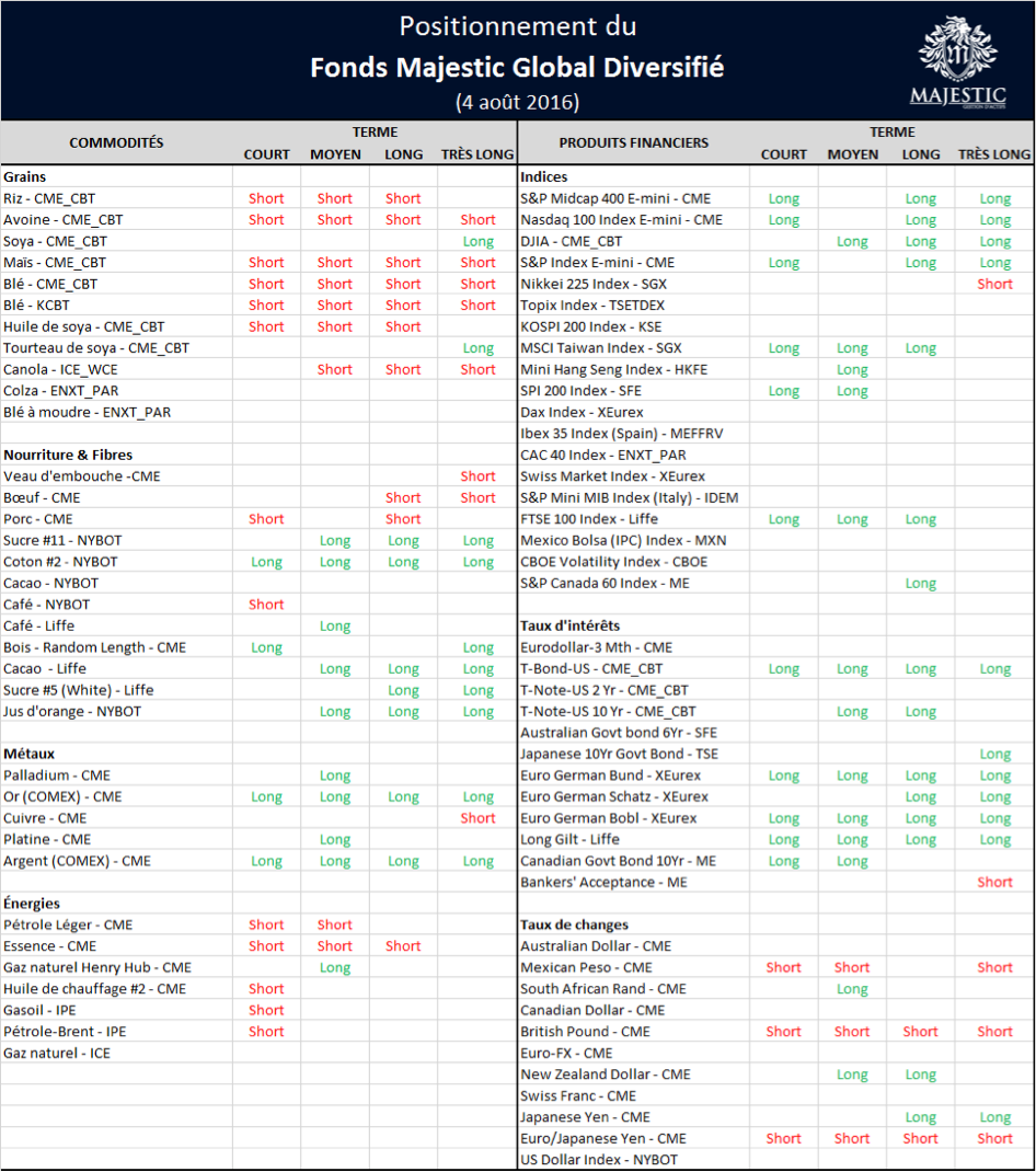 Majestic vous permet d’accéder gratuitement aux positions du portefeuille d’un gestionnaire professionnel. Nous vous offrons une transparence complète en publiant les positions du Fonds Majestic Global Diversifié de façon hebdomadaire sur Grainwiz et par infolettre (cliquez ici pour vous inscrire).  Bien sûr, le moment exact des transactions et le poids de chaque position n’est pas divulgué, mais ce rapport hebdomadaire vise à vous partager les tendances qu’identifient le modèle quantitatif d’un gestionnaire professionnel.