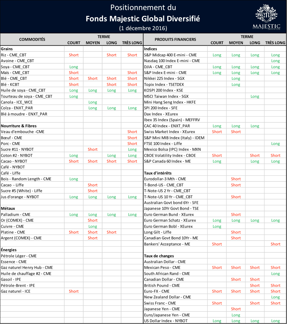 Majestic vous permet d’accéder gratuitement aux positions du portefeuille d’un gestionnaire professionnel. Nous vous offrons une transparence complète en publiant les positions du Fonds Majestic Global Diversifié de façon hebdomadaire sur Grainwiz et par infolettre (cliquez ici pour vous inscrire).  Bien sûr, le moment exact des transactions et le poids de chaque position n’est pas divulgué, mais ce rapport hebdomadaire vise à vous partager les tendances qu’identifient le modèle quantitatif d’un gestionnaire professionnel.
