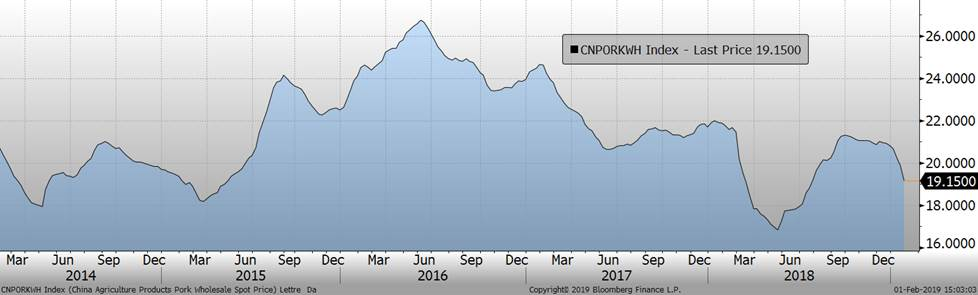 Depuis le début de l’année, le prix de gros du porc en Chine est sur une pente descendante à 19.15 CNY/KG (1.69 $CA/lb). Les chinois craignent de voir une deuxième correction comme ce fût au 2ème trimestre 2018 lorsque le prix de gros avait baissé jusqu’à 17 CNY/kg… De plus en plus, les éleveurs chinois ont de la difficulté à atteindre la rentabilité ce qui explique la liquidation du cheptel reproducteur depuis des années. Environ 40% de la production chinoise (donc 20% de la production mondiale) provienne d’éleveurs de moins de 500 porcs/an et ces éleveurs sont en train de sortir de l’élevage laissant la place à une restructuration de l’industrie porcine en Chine.