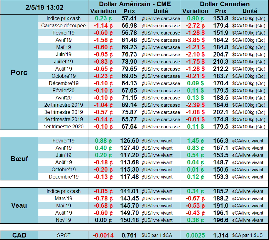 Le prix du bœuf a remonté hier, supporté par la force du prix des découpes ainsi qu’un meilleur prix cash rapporté après la fermeture de vendredi. Premièrement, le prix du Select est à 213.7 ¢/lb, le plus haut prix depuis mars 2018 démontrant la forte demande américaine. Pour sa part, le Choice est dans le haut des 7 derniers mois à 217 ¢/lb. Deuxièmement, le prix cash publié vendredi était de 123.65 ¢/lb au Nebraska et environ 124¢ au Kansas. Le marché demeure optimiste pour le mois de février puisque le contrat pour la fin du mois se transige à 126.5¢ aujourd’hui.