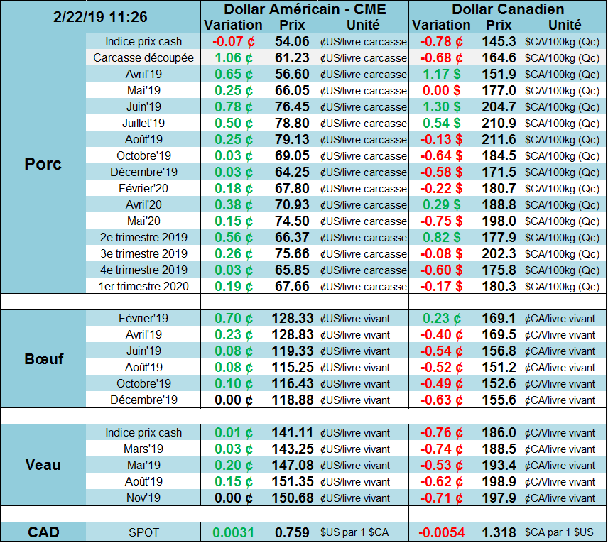 Les importations américaines de porcs devraient atteindre 5.2 millions de têtes d'ici 2019, soit une légère diminution par rapport à 2018. Les stocks de porcs canadiens du 1er janvier 2019 seront publiés le 13 mars 2019, mais le rapport d'inventaire de mi-année indiquait que les éleveurs s’attendaient à mettre bas moins de truies pour la deuxième moitié de 2018. La majorité (86% en 2018) des porcs importés du Canada sont des porcs à l'engrais et les producteurs canadiens subissent probablement les pressions de la production accrue des États-Unis.