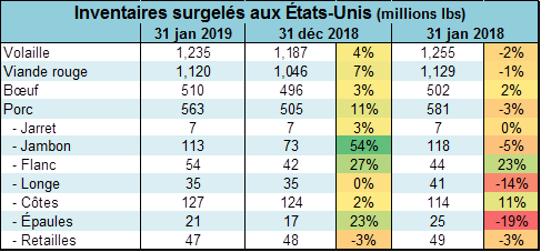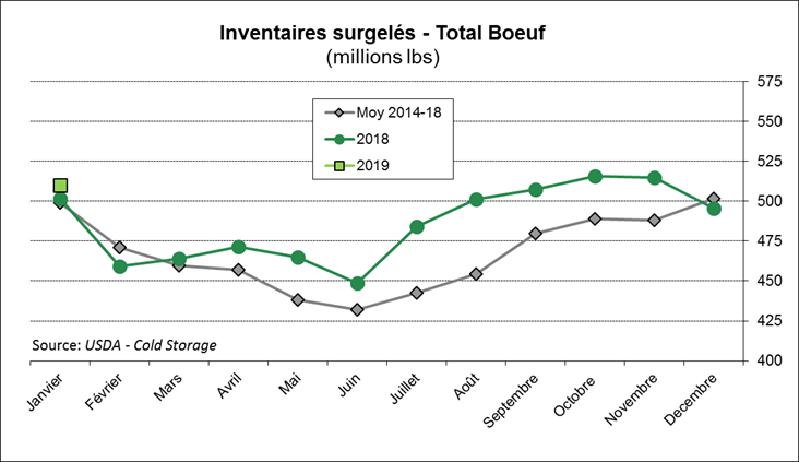 Pour le bœuf, les inventaires surgelés étaient de 510 M lbs, en hausse de 8 M versus l’an dernier. Au total, les stocks de viande rouge étaient à 1.12 milliard lbs, en baisse de -1% alors que les inventaires de volaille étaient à 1.24 milliard en baisse de -2%.