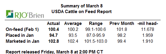 À 15h00 aujourd’hui, l’USDA publiait le rapport Cattle-on-Feed qui devait initialement être publié il y a 2 semaines. Au 1er février, il y avait 11.68 millions de bœufs en parc d’engraissement, soit 0.4% de plus que l’an dernier ce qui tombe dans le haut de la fourchette des prévisions. Depuis 10 ans, il y a seulement en 2012 que le troupeau en parc fût plus gros. Les placements en janvier étaient de 1.96 M têtes, en baisse de -5.3% versus l’an dernier alors que la fourchette des prévisions était de -13% à -4.1%.