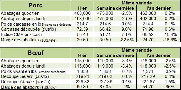 Les conditions climatiques aux États-Unis ont rendu les conditions de transport du bétail très difficiles. Le passage de la tempête la semaine dernière aura provoqué des inondations à plusieurs endroits et créer des « situations boueuses » à plusieurs autres. Ainsi le bétail se retrouve dans une situation pénible et l’accès est souvent impossible dans certains parcs. Les abattoirs n’hésitent pas à proposer des hausses sur le prix spot alors qu’ils peinent à remplir les usines. De plus, les gains de poids sont et seront moins rapides.