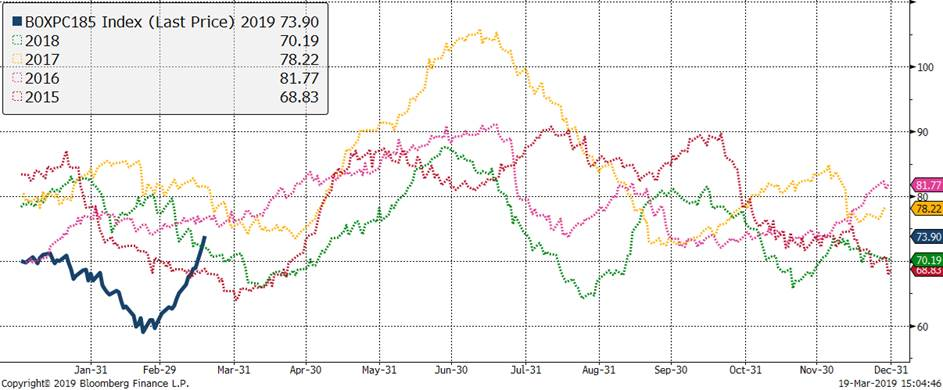 Un point qui encourage les acheteurs est le soudain ralentissement du rythme d’abattage. Alors que depuis le début de l’année 2019, les producteurs ont envoyés leurs porcs à un rythme de +5% par rapport aux mêmes semaines en 2018, la semaine dernière, les usines ont reçu 1.4% plus d’animaux que l’an dernier. L’offre se resserre tranquillement pas vite ce qui est favorable pour le prix cash.
