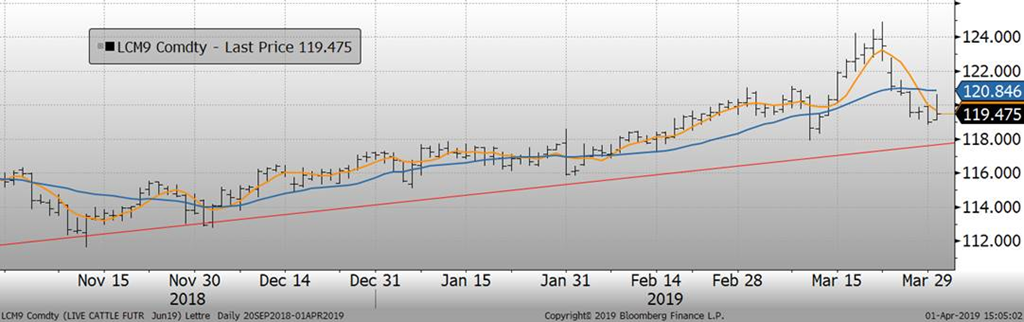 Le prix au comptant a chuté pendant toute la semaine dernière perdant près de $3/ tête. Le nombre de bœufs gras mis en marché fut de 614 000 ce qui représente une hausse de 4% par rapport à la même semaine en 2018. Le poids moyen des bœuf abattus était à la baisse de près de 11 livres par rapport à 2018. Ainsi malgré la hausse du nombre de bêtes abattues, la production de viande de bœuf était seulement à la hausse de 2.6%