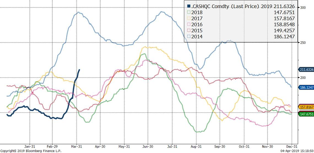 Pour ceux et celles qui s’intéressent un tant soit peu à l’analyse boursière, il faut absolument noter le comportement des contrats à terme de porc depuis 1 semaine, et ce, encore davantage avec la remontée des 2 derniers journées. Dans la première vague “acheteur” en mars, les contrats éloignés (fin 2019 et 2020) se sont rapidement hissés à la hausse tirant les contrats rapprochés. Dans un marché normalement « bullish », on devrait noter l’inverse, soit une montée des prix plus prononcée pour les contrats rapprochés. Les prix ont reculé à la fin mars retraitant de presque 50% de la hausse enregistrée pendant la première moitié du même mois. Or, dans la 2ième vague haussière que nous constatons présentement, les contrats de mai et juin sont définitivement les leaders dans cet environnement avec des gains plus rapides que les mois éloignés. C’est un signe qui ne trompe pas et suggère une forte demande de la part des consommateurs ou acheteurs. Pourtant, ces mêmes acheteurs ont semblé avoir ralenti sur leurs achats puisque depuis 3 jours alors que le prix de la découpe fait du surplace et même baisse. Devrait-on y voir quelque chose de temporaire?
