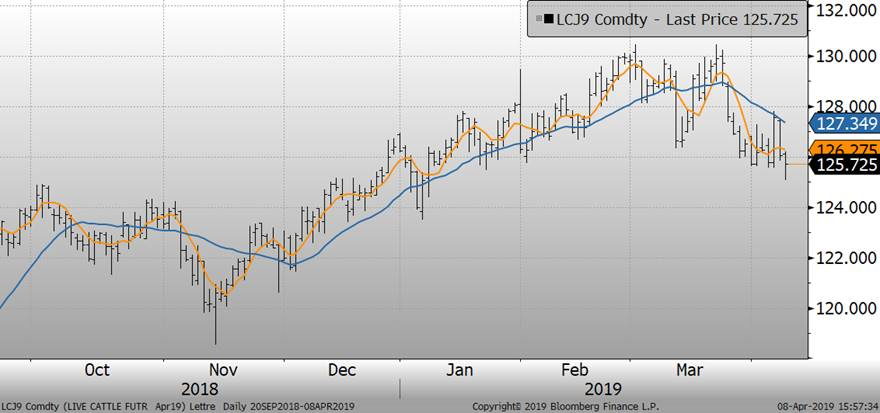 Les bouvillons réagissent négativement aujourd’hui et suivent la direction du porc. Pourtant, les conditions climatiques pluvieuses et apportant de grandes quantités de neige sur les Plaines américaines ce mercredi et jeudi devraient normalement faire grimper les prix. Les températures froides devraient aussi supporter les prix, mais le début d’une tendance baissière sur le cash met une pression négative sur le contrat d’avril. Le prix au comptant au Texas et Kansas a négocié à $124.00 vendredi dernier, en baisse d’environ 2 cents.
