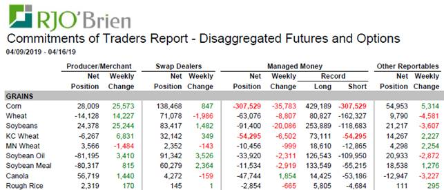 Ils vendent. Encore. À chaque fois il poussent le record de volume encore plus loin. Short 307 milles contrats de corn c’est du stock en siouplait. Les inventaires sont élevés, ils misent qu’il vont le demeurer. Je trouve ça confiant au mois d’avril mais à date ils ont raison. Les stocks sont abondant… À Chicago le prix du jour est à 3.55 $bu et 3.82 $bu pour la nouvelle récolte. Je m’imagine que les spéculateurs misent que rendu à l’automne avec l’abondance prévu le prix tendra vers ce fameux 3.50 $bu. À suivre, mais