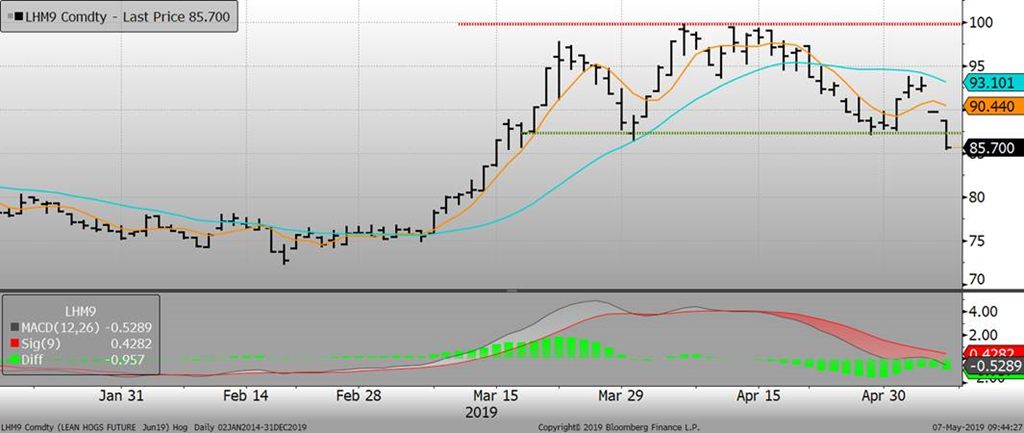 En raison de la baisse maximale de 3 cents hier, les limites seront de 4.5 cents/lb aujourd’hui à la Bourse de Chicago et le marché l’a déjà atteint après seulement 10 minutes de négociation. En deux jours, l’ensemble des échéances ont perdu 7 à 7.5 cents/lb, à l’exception du prix de mai. Techniquement, les prix ont cassé le support, établissant un nouveau beau depuis l’ascension de mars. Le prix de juin est à 85.5 cents/lb.